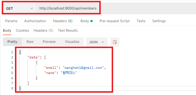 어플리케이션을 실행하여 테스트를 해보도록 하겠습니다. 테스트는 Postman을 사용하였습니다. application.yml 파일에 설정했다시피 9000번 포트로 API를 호출하면 됩니다. [여기서는 application.yml의 설정 파일로 실행되기 때문에 로컬(호스트 PC)에 있는 h2 DB에 커넥션이 이루어집니다.]