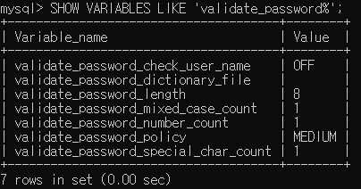 https://kamang-it.tistory.com/248 - [MySQL] 패스워드 정책 확인, 변경하기