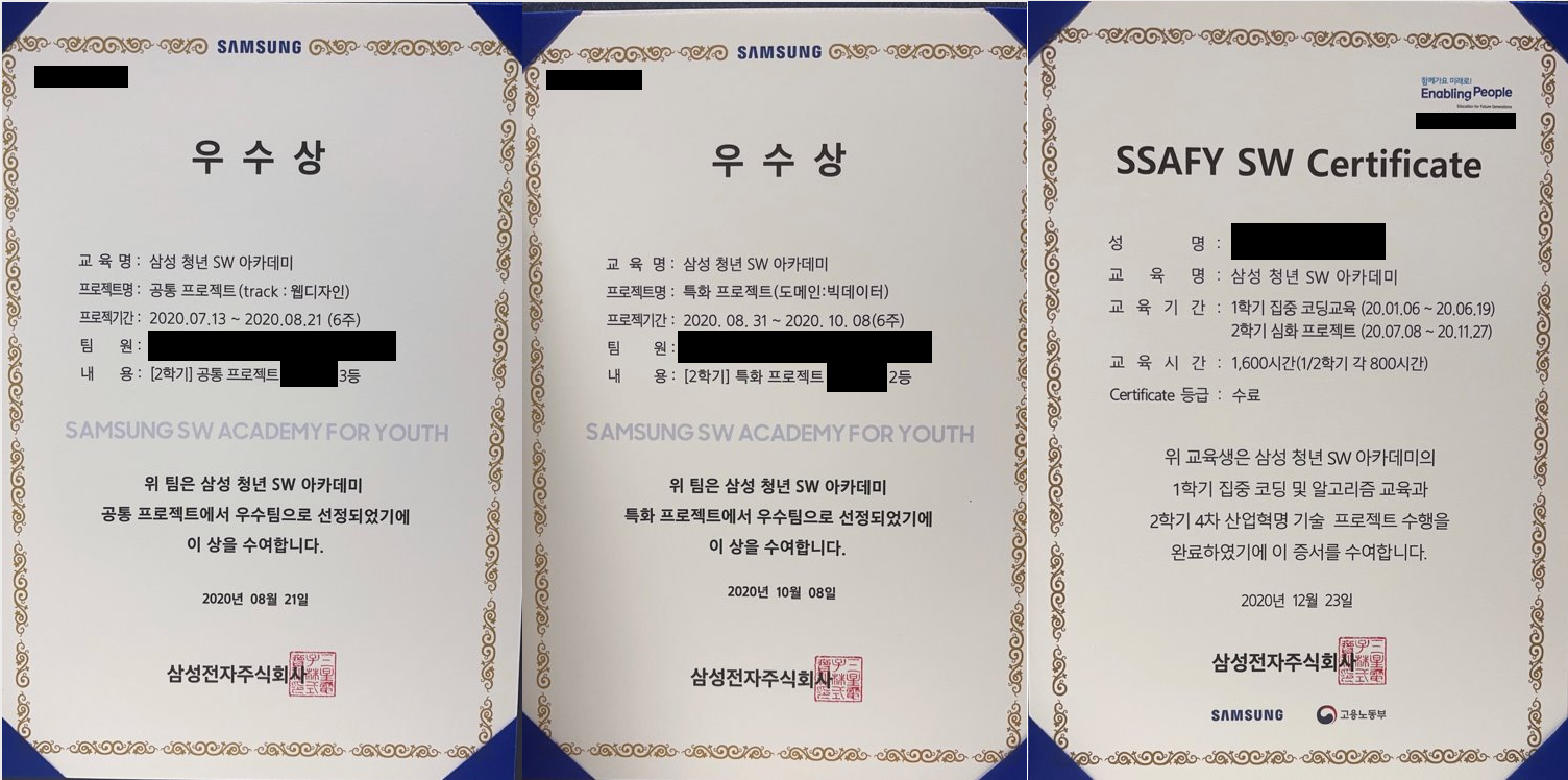 프로젝트가 끝나면 발표도 하고 평가를 해서 반 별로 수상 하기 때문에 열심히 개발하셔서 꼭 입상하시기 바랍니다. (입상하면 돈 줍니다!!) 결론적으로 저는 열심히 개발했던 공통 프로젝트에서는 반 3등으로 입상하였습니다. 사실 1, 2등을 할 줄 알았지만 3등을 해서 아쉬운 부분도 있었지만, 3등도 정말 잘한 성적이기 때문에 만족했습니다.