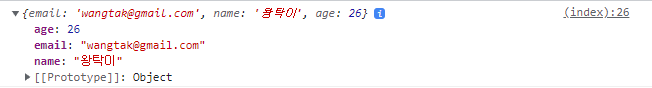 f12를 통해 개발자 도구를 열어 주시고 console에 가보시면 먼저 6번에 해당하는 member 객체의 정보가 정상적으로 출력된 것을 확인할 수 있습니다.