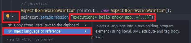 오늘의 포스팅 내용은 강의를 들으면서 라이브 코딩을 하던 와중에 AspectJExpressionPointcut을 통해 pointcut의 표현식을 정의하는 코드를 접했습니다. 그런데 영한님의 pointcut 표현식 코드에는 JPQL을 작성할 때 처럼 Code Assistant, 코드 하이라이팅 기능이 있어서 자동 완성을 제공하였지만, 제 IntelliJ는 pointcut 표현식을 문자열로 인식했습니다. 그래서 이 문자열을 IntelliJ에서 pointcut 표현식으로 인지하게끔 설정하는 내용을 정리하도록 하겠습니다.