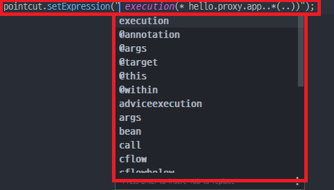PointcutExpression을 클릭해주면 다음과 같이 문자열로 보였던 코드가 하이라이팅이 되고 뭔가 의미를 내포하고 있는 거 같은 코드가 되었습니다. 또한, setExpression에서 Ctrl + Space (윈도우 기준입니당)를 하게 되면 PointcutExpression의 문법과 관련된 자동 완성 기능도 지원하는 것을 알 수 있습니다.