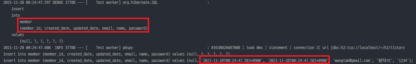 또한, @PrePersist 어노테이션이 있기 때문에 persist가 되기 전에 어노테이션이 붙어있는 prePersist() 메서드가 실행되어 각각의 멤버 변수[createdDate, updatedDate]를 현재 시간으로 값을 설정했고, 그에 맞게 쿼리가 나가는 것을 확인할 수 있습니다.