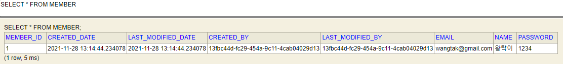 실무에서는 Spring Security를 사용하기 때문에 SecurityContext에서 로그인 한 사용자의 ID를 가져오면 됩니다. 지금은 공부를 위해서 무작위 값을 세팅하도록 하였습니다. Auditing 정상적으로 적용되었는지 확인 후에 Spring Security를 적용한 Auditing 예제 코드를 설명하겠습니다.