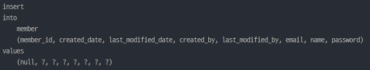 이메일, 이름, 비밀번호를 사용하여 Member 객체를 만든 후 member를 저장하면 아래와 같은 쿼리문이 나가는 것을 확인할 수 있습니다.