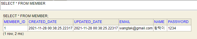 Member Entity에는 email, name, password만 적어줬는데, 수행된 쿼리문을 보면 created_date, updated_date가 있음을 알 수 있습니다. 이는 Member Entity가 @MappedSuperclass를 가진 JpaBaseEntity를 상속받았기에 컬럼이 추가된 것입니다.