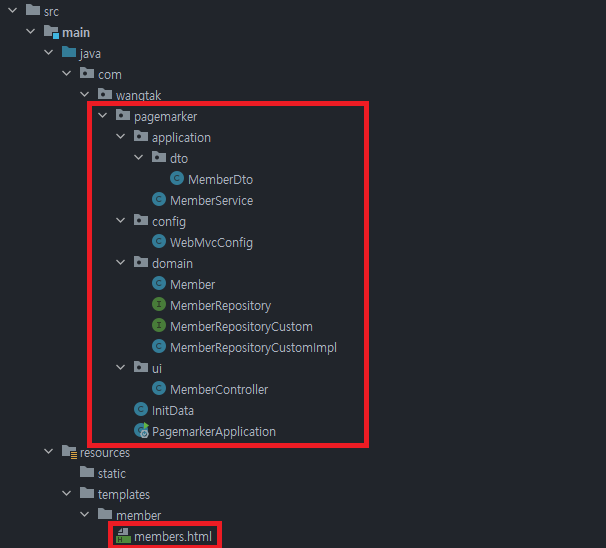 Controller로부터 받은 [Model - Page<MemberDto> members]를 화면에 표현하기 위해 Thymeleaf 문법을 적용했습니다.