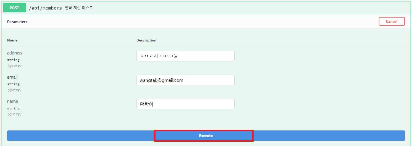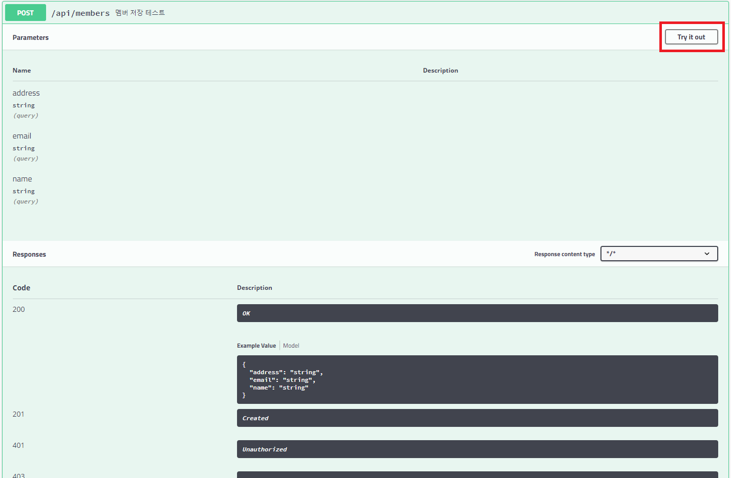 문서화를 해봤으니 Swagger의 장점인 문서에 있는 API 테스트를 해보도록 하겠습니다. 테스트할 API는 [POST] /api/members입니다.