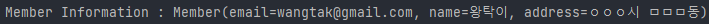 return ResponseEntity.ok(new Member("wangtak@gmail.com", "왕탁이", "ㄱㄱㄱ시 ㄴㄴㄴ동"));