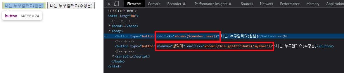 그러나 "나는 누구일까요(수정본)" 버튼에는 myName이라는 attribute가 추가되었고, 그 결과 나는 누구일까요(수정본) 버튼을 눌러보면 다음 사진처럼 우리가 원했던 매개변수가 잘 도착한 것을 확인할 수 있습니다.